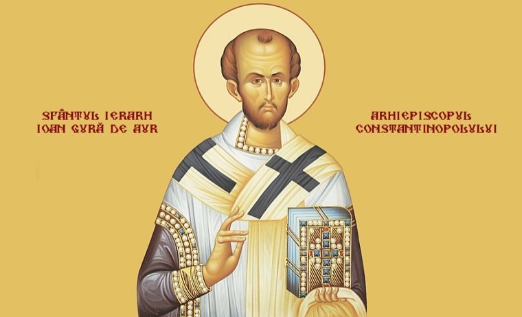 Acest mare dascăl şi luminător al lumii, Sfântul Ierarh Ioan Gură de Aur s-a născut în Antiohia, în anul 344, din părinţi drept-credincioşi: tatăl său se numea Secund şi era căpetenia Siriei, iar mama sa se numea Antuza. Din fragedă vârstă şi-a pierdut tatăl, iar mama sa nu s-a mai recăsătorit, deşi era foarte tânără. Sfânta Antuza şi-a dedicat viaţa creşterii copilului ei. Sfântul Ioan a fost botezat la vârsta de 20 de ani şi a avut parte, prin grija mamei sale, de cei mai renumiţi dascăli din Antiohia: Libaniu şi Andragatie. Încă de la început, sfântul arătă o mare dragoste faţă de ştiinţa vorbirii şi cu ascuţimea minţii ce avea a deprins toată ştiinţa elinească. Tot aşa a ajuns la stăpânirea creştineştilor Scripturi, având doi îndrumători de seamă: pe Sfântul Meletie, Arhiepiscopul Antiohiei, şi pe Diodor din Tars, căpetenia Şcolii din Antiohia. Pe lângă studiul ştiinţei elineşti şi al teologiei, s-a nevoit şi într-o casă creştină de asceţi din Antiohia. Apoi s-a retras doi ani în pustie, într-o peşteră. De aici a fost chemat, împotriva voinţei lui, la diaconie (381) şi apoi la preoţie (386). Atunci a scris cartea sa, „Despre preoţie”. Ca preot, timp de 12 ani a fost slujitorul şi predicatorul Patriarhiei din Antiohia, alcătuind renumitele sale cuvântări. Din acest timp de la el ne-au rămas Cuvântările asupra Evangheliei de la Matei, Cuvântările despre statui şi Cuvântări la cele 14 Epistole ale Sfântului Apostol Pavel. Părăsind această viaţă Arhiepiscopul Nectarie al Constantinopolului, Sfântul Ioan a fost chemat, din porunca împăratului Arcadie, ca să fie sfinţit el arhiepiscop al cetăţii de pe malul Bosforului. Ca patriarh al Constantinopolului (398), s-a ostenit cu răspândirea credinţei şi convertirea goţilor arieni şi a întemeiat aşezăminte pentru săraci, fecioare şi văduve. Sfântul Ioan Gură de Aur predica permanent şi, pentru că a mustrat-o pe împărăteasa Eudoxia pentru nelegiuirile ei, şi-a atras ura aceleia. A fost îndepărtat de două ori din scaun, murind în exil la Comane, în Armenia, la 14 septembrie 407. Cel mai mare predicator al Ortodoxiei mai este pomenit la 27 şi 30 ianuarie, dar şi în fiecare zi în care se săvârşeşte Liturghia alcătuită de el.